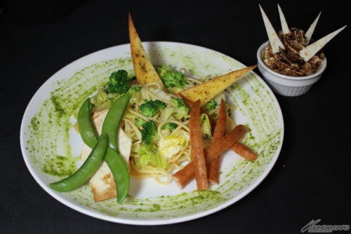 A cabbage and broccoli spaghetti recalling the awakened Unicorn Gundam. Includes a mascarpone dessert themed after the Banshee.
