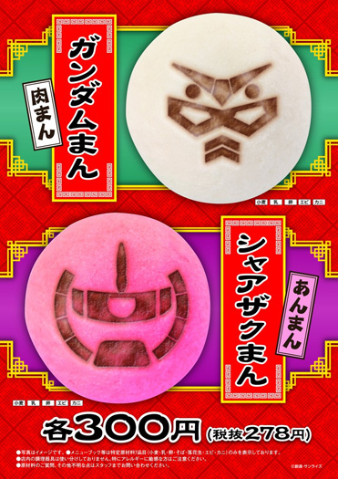 いずれもモビルスーツの顔をイメージしたデザインとなっており、「ガンダム」は“肉まん”、「シャアザク」は“こしあんまん”となっている。