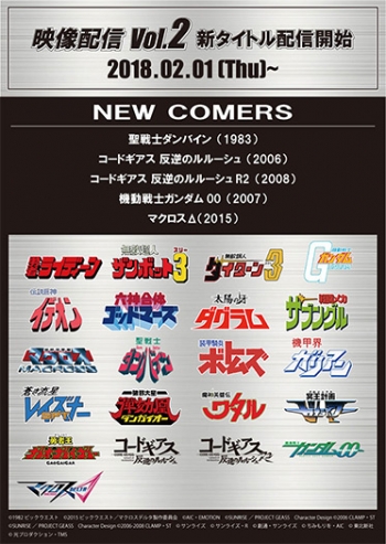 「映像配信 Vol.2」では、『機動戦士ガンダム00』、『聖戦士ダンバイン』、『コードギアス 反逆のルルーシュ / 反逆のルルーシュ R2』が新登場。現在配信中のものとあわせると合計20タイトルとなり、さらに新たなコラボメニューも提供される。