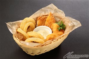 ・Frites de fromage Camembert, frites de poisson blancs, rondelles d’oignon