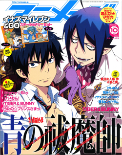 This month features a cover and feature for Blue Exorcist as it approaches its climax! The cover features the Devil Brothers Rin and Mephisto! Our 17-page feature covers it all, including anime-only plots! Writer Ryota Yamaguchi points out seven keys to the climax! Plus, Nobuhiko Okamoto (Rin), Jun Fukuyama (Yukio), and Hiroshi Kamiya (Mephisto) speak! Check out the photo pinup and the questions submitted via Twitter! Here's where to look if you want to know all about AoEx. The Q&A answers all your questions. Plus an illustrated message from director Tensai Okamura! For bonuses, let's start off with an Inazuma Eleven and Inazuma Eleven GO stationery set! Both notepad and shitajiki are the perfect size for the new semester's studies! We also throw in one of two Puella Magi Madoka Magica book card for everyone who responds to our survey! There's also a booklet featuring Natsume Yujincho S3 and the new show Kimi to Boku! Fans of both series will love it! And last but not least, we've got the latest updates on K-on! the Movie! With December 3rd approaching, the secrets begin to come out! The plot is... The Light Music Club's graduation trip to London, of course! If you just can't wait to see, TBS producer Yoshihisa Nakayama will fill you in! We've got the info right here! Plus commects from director Naoko Yamada! This month features sealed pinups from four series! Tiger & Bunny's Barnaby features in 'Hero's Day Off', K-on!'s Yui and Azusa visit London, we peek into Masato and Ren's room in Uta no☆Prince-sama♪Maji Love 1000%, and the Winter trio from Starry Sky all appear in brand-new art! We also feature interviews with Tiger & Bunny writer Masafumi Nishida and producer Kazuhiko Tamura, and a special interview with the writer and assistant director of Mawaru Penguindrum! Plus don't miss our Autumn previews of Boku ha Tomodachi ga Sukunai, Shakugan no Shana III, and Mobile Suit Gundam AGE! Anime fans, rush to your newsstands today!
