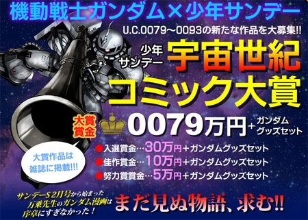 The winner will receive a price of ¥"0079"0,000, along with a Gundam merchandise set, and their story will be published in Shonen Sunday. Entries must be in by the end of June, 2013.