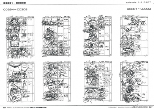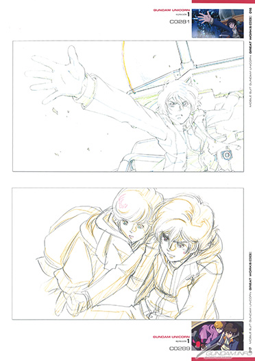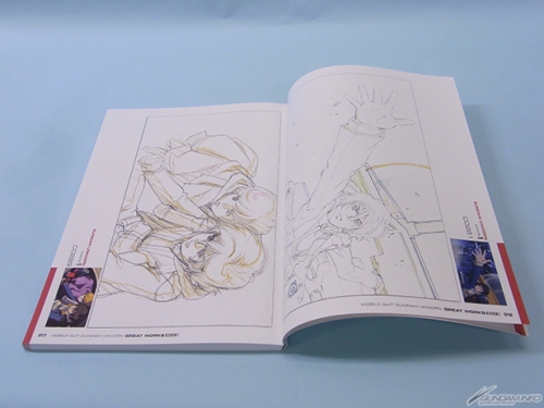『ガンダムUC』では、1カットあたりの原画枚数が多いため、 「原画集」ではカットごとにベストな原画をピックアップし、何層にもおよぶ原画と作画監督による修正原画を合成し、1枚の絵になるようにしたものを掲載している。