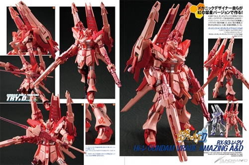 ▲「HGBF 1/144 Hi-νガンダムヴレイブ」の作例2つに、今号のガンプラ武器付録「アメイジングレヴD」を装着。最強形態に仕上げている。