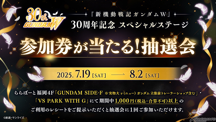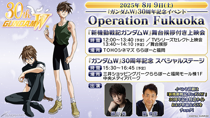 TOHO Cinemas LaLaport Fukuoka accueillera une projection de Mobile Suit Gundam W avec accueil sur scène, tandis que le Central Media Park au premier étage du centre commercial LaLaport Fukuoka accueillera un événement spécial sur scène du 30e anniversaire de Gundam W.