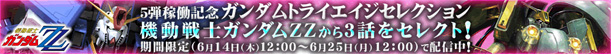 デジタルカードゲーム「ガンダムトライエイジ」公式サイトにて、最新弾となる5弾の稼働開始記念として『機動戦士ガンダムΖΖ』よりセレクトされた3話が期間限定で無料配信される。