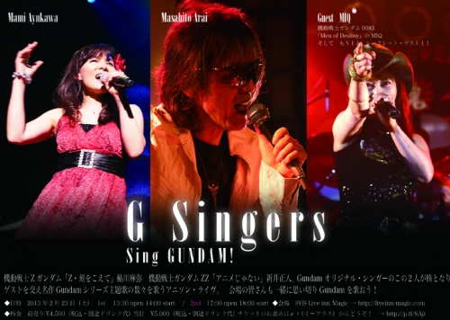 "G Singers ~Gundam wo Utao!~" will gather Gundam theme singers at the Yotsuya Live Inn MAGIC in Tokyo on February 23rd.