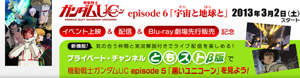 バンダイチャンネルは、月額1,000円(税抜)で対象作品が見放題となる「アニメ・特撮見放題」の有料会員向けの新サービス「ともストβ版」をスタートし、その第1回として、『機動戦士ガンダムUC episode 5「黒いユニコーン」』のライブ配信を、明日3月8日(金)に実施する。
