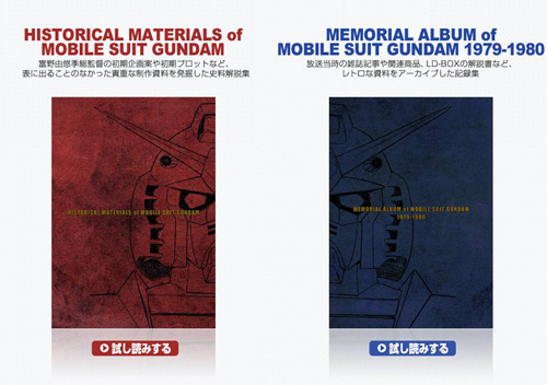 今回一部試し読みが楽しめるのは、富野由悠季総監督による初期企画案や初期プロットなど、これまで表に出ることのなかった貴重な制作資料発掘した史料解説集「HISTORICAL MATERIALS of MOBILE SUIT GUNDAM」と、放送当時の雑誌記事や関連商品、LD-BOXの解説書など、レトロな資料をアーカイブした記録集「MEMORIAL ALBUM of MOBILE SUIT GUNDAM 1979-1980」の2種類。
