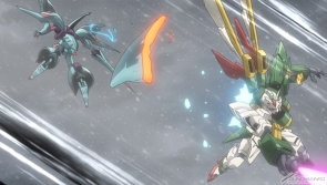 The Qubeley Papillon has a perfect record stretching back to the preliminaries—but Fellini with his Wing Gundam Fenice brings lightning speed and a and well-honed skills to the matchup.