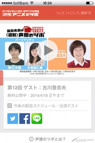 アプリでは、「〈月刊〉アニメのツボ」のコンテンツに加えて、毎週金曜更新のラジオ番組「阪口大助の〈週刊〉声優のツボ」もあわせて視聴することができる。