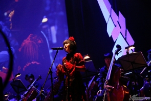 ライブは、サイアム・ビストの独白から始まる映像でスタートし、まずは澤野氏とバンド[nZk]のメンバーとともAimerさんが、episode 7の主題歌「StarRingChild」を披露。そして、スクリーンに映し出される「ガンダムUC」各章の印象的なシーンと、オーケストラによる劇中曲の生演奏が、ひとつに融合しながらステージは進行していった。