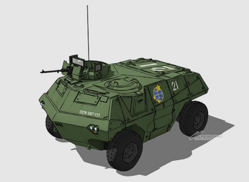 U.C.0062年に制式採用された地球連邦軍の装甲車両。防弾性の高い装甲で車体が覆われており、戦地への速やかな兵員輸送や移動を行うことができる。車体上面には、重機関銃が設置されており、多少の自衛戦闘にも対応することができる。地球連邦軍製の車輌だが、ムンゾ自治共和国防衛隊にも貸与されており、地球連邦軍はグレー、ムンゾ自治共和国防衛隊はグリーンに塗装されている。